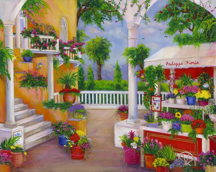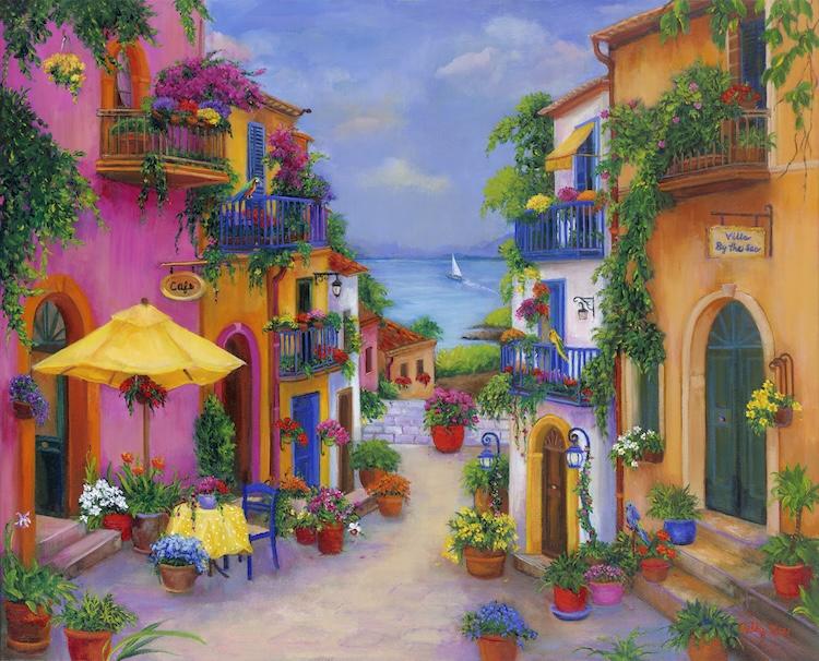 A painting of a Beautiful Seaside Patio on the Coast of Italy.